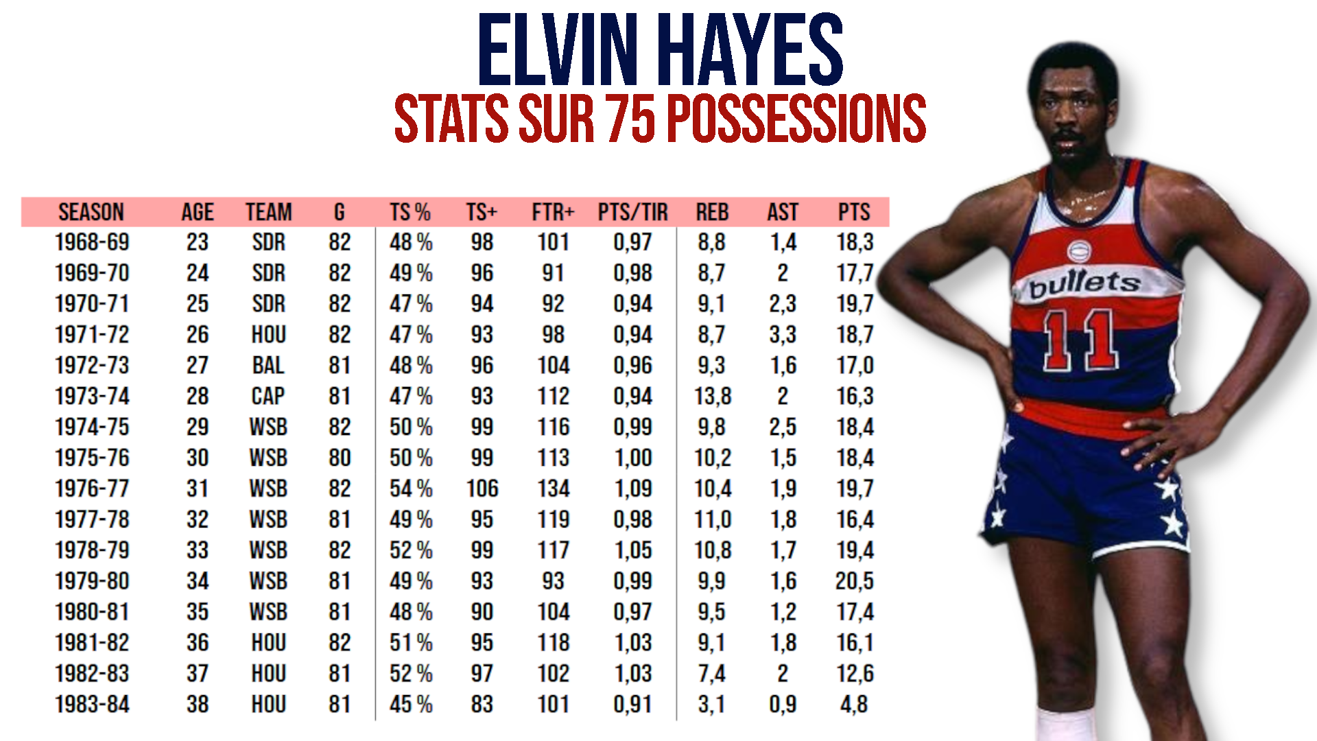 Elvin Hayes est considéré comme un des meilleurs scoreurs des années 70, il est pour beaucoup un intérieur dominant. Alors, quand je me penche sur ses statistiques en carrière, je m’attends à découvrir des indices confirmant qu’il est un des marqueurs les plus infaillibles de son temps. Mais que nenni, après avoir creusé le sujet, je me rends compte qu’il se trouve toujours dans les abysses des classements d’efficacité. Toujours ? Non, il y a une exception : la saison 1976/77.