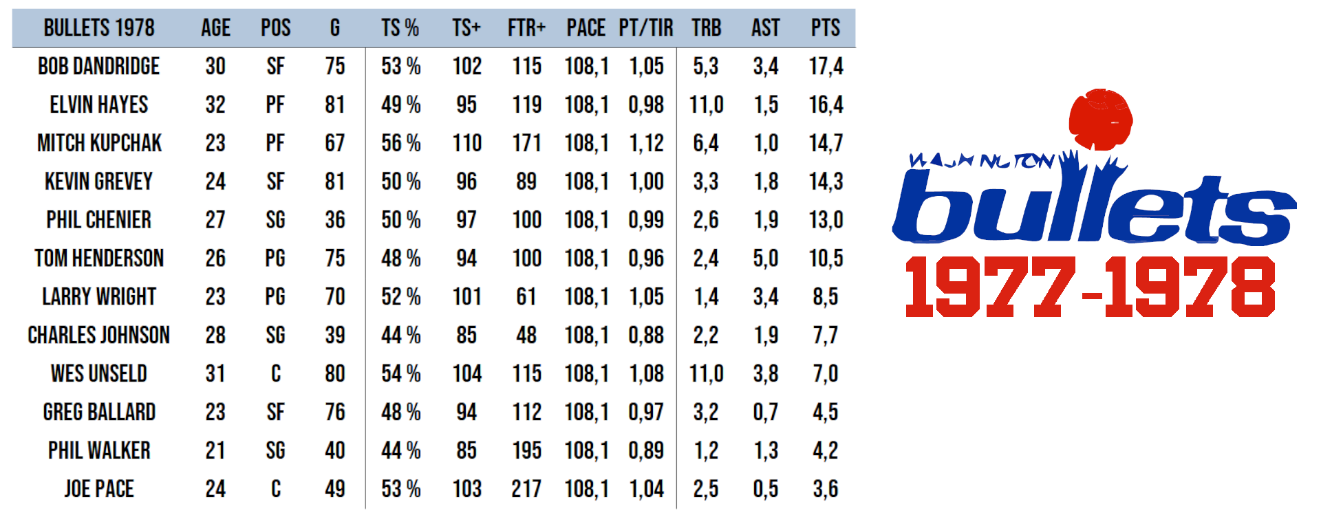 Wes Unseld est de retour pour les phases finales et E peut reprendre sa cape de leader d’attaque. Sur l’ensemble de la série, il est étincelant, 26 points et 16 rebonds de moyenne avec 53 % de réussite aux tirs. Il domine ce round, mais pas le Game 7. Il ne marque que 12 points en 37 minutes avec un horrible 5 sur 15 aux tirs. Il déclare que sa mauvaise performance est essentiellement due à la fatigue. Son entraîneur K.C Jones abonde dans son sens en rappelant qu’il a porté l’équipe sur son dos une bonne partie de la saison. Il est aussi celui qui a été la seule arme offensive des Bullets dans ce tour et on lui pardonne d’avoir craqué dans la dernière rencontre.
