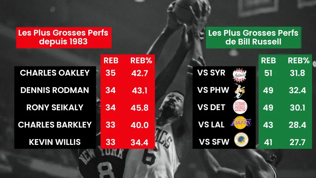 C’est bien simple, de 1980 à nos jours, il n’y a que 90 rebonds disponibles par rencontre. Même le plus fou des rebondeurs ne peut espérer atteindre un tel record. Bill Russell a quant à lui eu cette possibilité d’évoluer dans un contexte favorable à la performance. D’ailleurs, avant lui, c’est Neil Johnston qui détient la plus grande marque de l’histoire avec 39 rebonds captés un soir ou les Warriors et les Syracuse Nationals nous gratifiaient d’un match à 30 % de réussite.