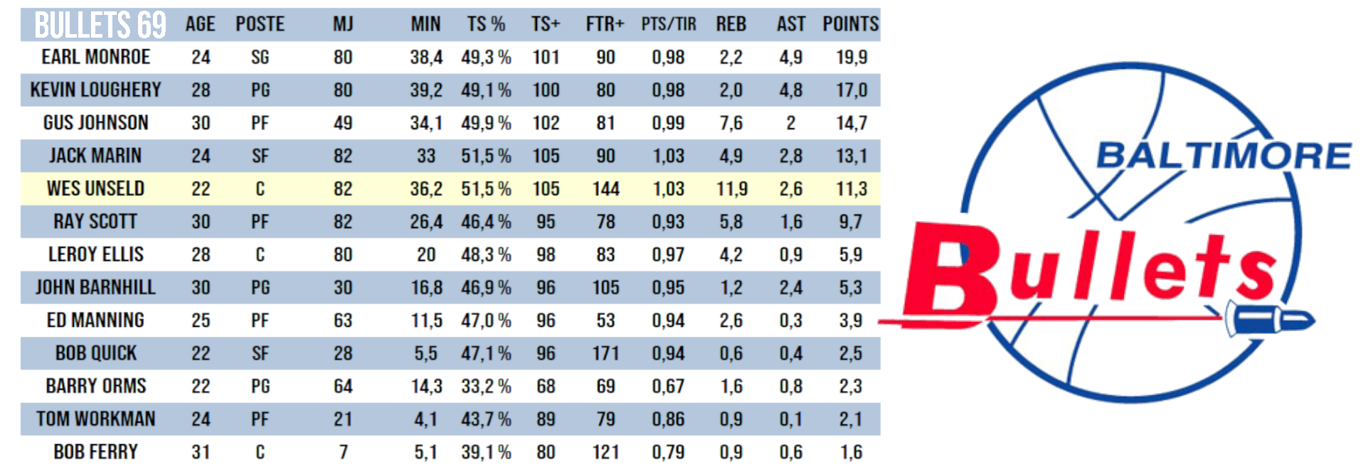 Même scénario lors de la loterie suivante. Baltimore veut Elvin Hayes, mais le coin-flip ne leur est pas favorable et c’est Wes Unseld qui est choisi. La mauvaise fortune des Bullets finit malgré eux, à bâtir un socle solide autour d’un nouvel l’entraîneur, et de deux jeunes stars complémentaires. Mais lorsqu’on pose la question à coach Richie Guerin des Atlanta Hawks au lendemain de sa cuisante défaite : qu’est-ce qui fait des Bullets une équipe si forte ? Sa réponse est claire et sans aucun doute : « c’est Wes Unseld ».